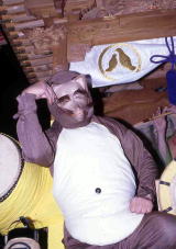 ![]() 荒々しい顔の狐。 神の力を表しているともいわれる。踊りもとてもきびきびしている。 | ![]() ユーモラスな狸の踊り。豊作を願う意味もあるという。 | ![]() おどけた仕草がとても面白い。 この他にもおかめや獅子舞など多数登場する。 |