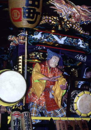 山車は、二段のせり上がり方式で一番上に人形が配置されています。この人形は神話の神様であったり、物語の登場人物であったり、人々になじみの深いものがモデルになっているようです。また、この山車は一本柱構造で、上の屋台の部分がくるりと回転できるようになっており、これにより柔軟に進行方向を変えることも可能となっています。山車は、鳶の頭の拍子木の合図で動いたり止まったりします。そして、それぞれ町の人たちがみんなで力を合わせて山車を引っ張り進んでいきます。